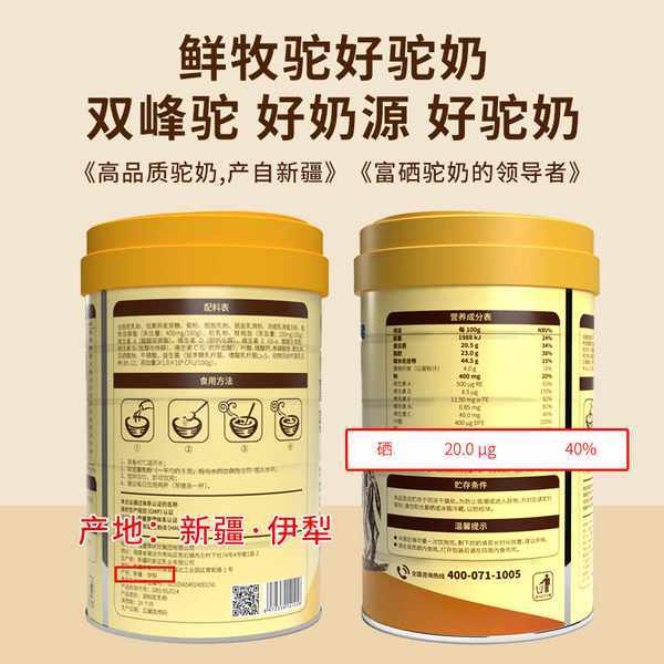 然后还可以看生产地,一般新疆、内蒙古等地生产多是真驼奶粉。