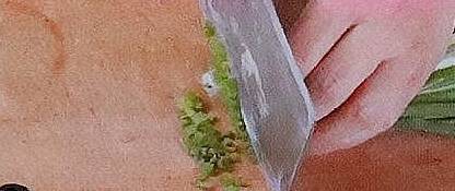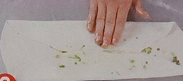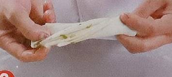 二。在均匀地涂抹上香葱汁,对向折起,再刷油,涂抹葱花。