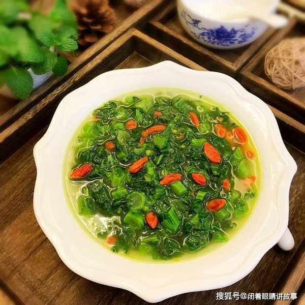 菜心250克,枸杞10克,香葱末10克,盐适量,胡椒粉适量,花生油适量,清水适量。