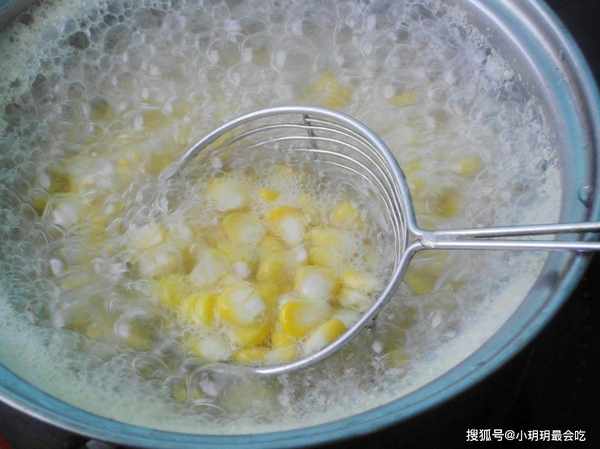 3、玉米粒熟了之后,用漏勺挖出来,放到一个碗里,加入适量的玉米淀粉。