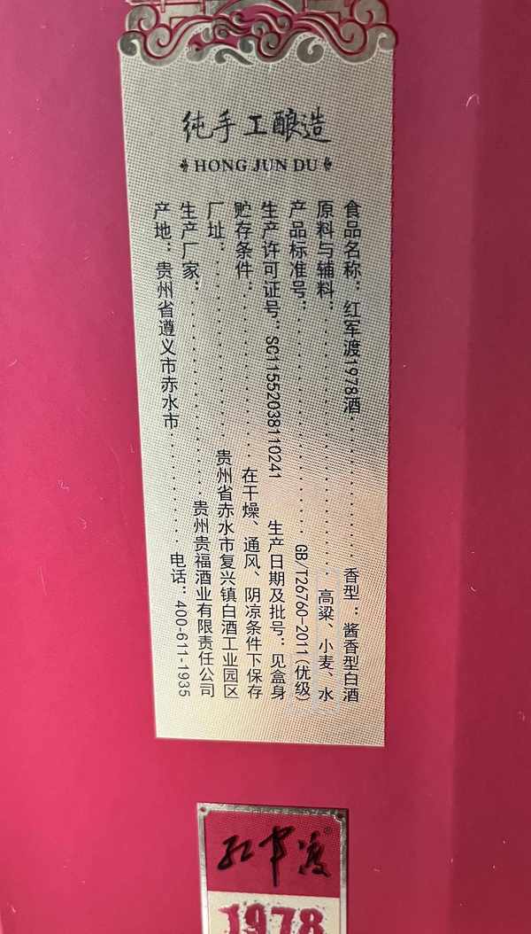 香型会标明,这是酱香型、清香型、还是浓香型的酒,而原料和辅料中,只包含粮食和水的配料表是最干净的,表明这是纯粮酒。如果还含有酒精,乙醇之类的物质,那就说明是兑出来的酒水了。而等级是纯粮酒的专属标志,一般有三个级别,分别为优级、一级、二级,其中优级就是品质最好的酒。大家可以参考红军渡的配料表,像这样的酒,就是品质非常高,非常纯净的纯粮酱香型白酒了。
