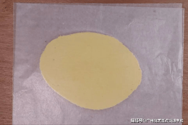 将冷藏好的面团取出来,放在烘焙纸上,用擀面杖擀成7mm左右的厚度