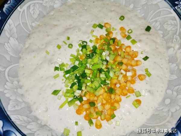 2、第二天早起的时候,取出来面糊,看到面糊明显变大,里边气孔均匀,就是发酵好了,在发好的面糊中加入煮熟的新鲜玉米粒以及葱花末,搅一搅排出里边的空气。