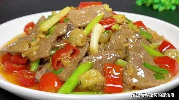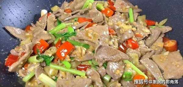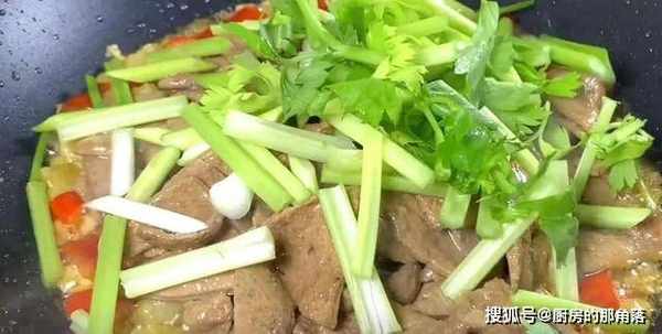7.猪肝回锅,再倒入芹菜段,翻炒均匀。