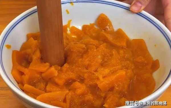 1.南瓜切薄片,水开上汽上锅蒸至能插进筷子,即可出锅,用擀面杖碾成南瓜泥。