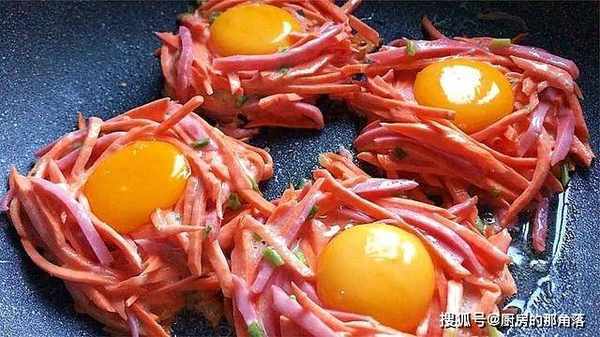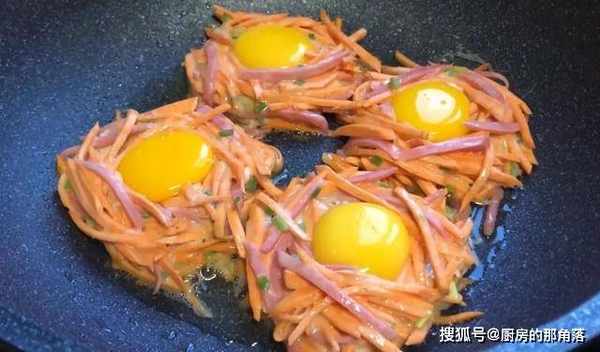 7.将蛋黄放进鸟窝中间,煎至定型。
