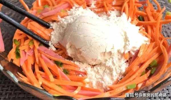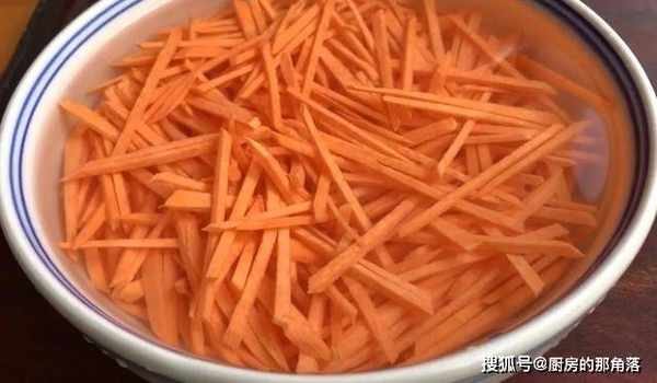 1.红薯去皮后切成红薯丝,切好放入大碗中,加适量清水,再加一勺食盐,将红薯丝泡软。