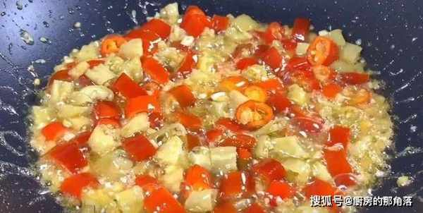 6.另起锅烧油,倒入姜、蒜、泡椒,爆出香味。