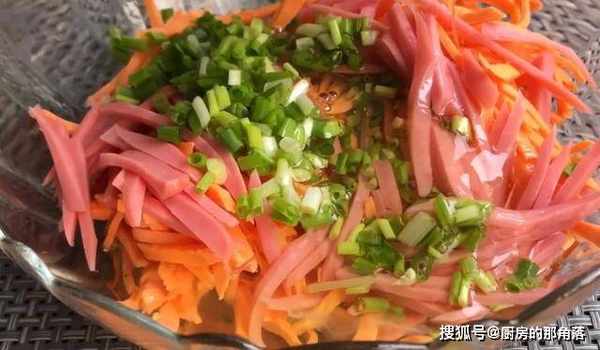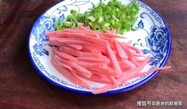4.红薯浸泡好,挤干水分放入碗中,再倒入火腿丝、蛋清、葱花,适量食盐、五香粉调味,拌匀。