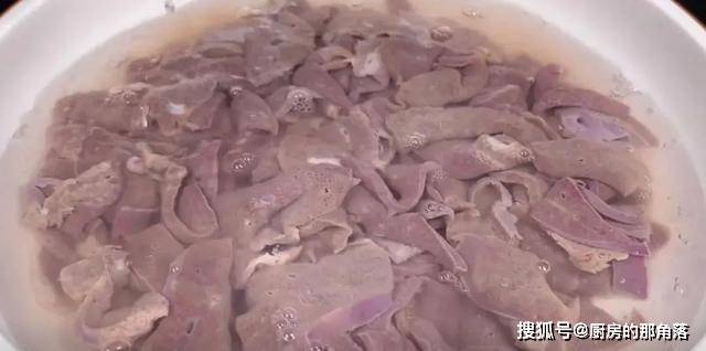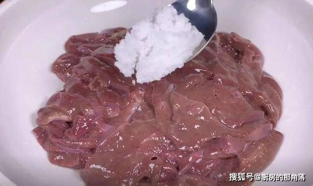 1.猪肝切薄片,尽量切薄一些,全部切好加一勺面粉、食盐,抓洗出血水。