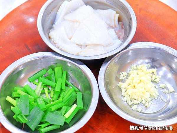 清洗干净的鱿鱼先斜着45度打上花刀,再换个方向切出菱形的花纹,然后再切成段,鱿鱼须斜刀切成宽条备用;几粒大蒜拍扁切成末;几根小葱切成葱段。