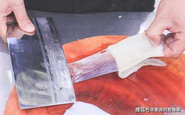 三个鱿鱼去掉鱿鱼须,再对半切开贴着鱿鱼的皮,片开一条缝用刀压着,撕下鱿鱼皮,鱿鱼须上的黑膜用刀刮掉。