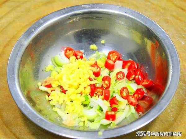 一段葱白切成葱花;几个小米椒切成小圈;一小块生姜切成姜末;几根小葱切成葱花备用。
