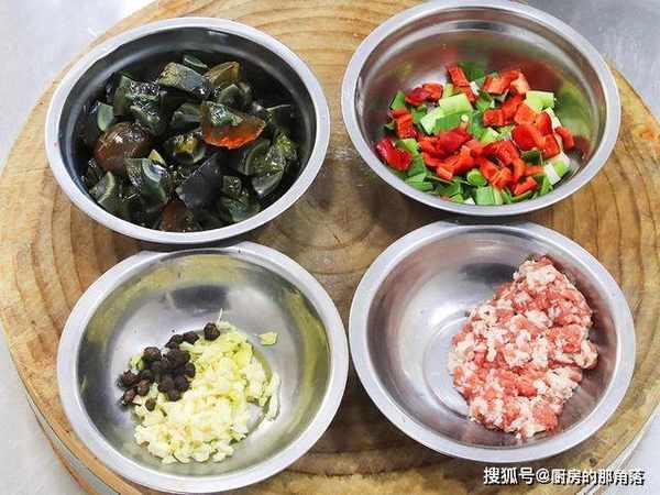 4个皮蛋放入锅中蒸制5分钟,去皮后切成四半,再切成大小相同的小块;一小块五花肉剁成肉沫备用。