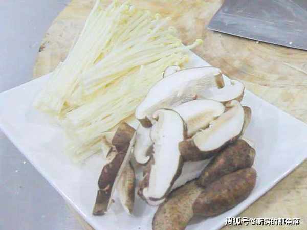 起锅烧油,油烧至6成热时,倒入准备好的肉片,滑至肉片表皮泛白后捞出控油,然后放入准备好的香菇和杏鲍菇,开中火炸1分钟左右捞出。