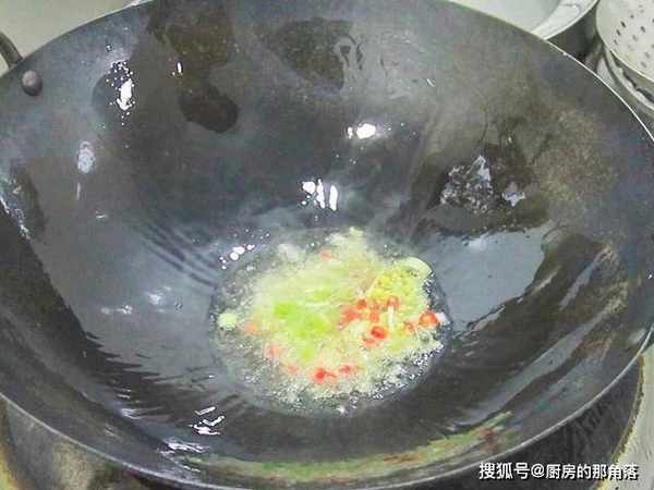 锅内烧油,油温七成热时起锅,把热油浇在蒜末上激出香味,美味即成。