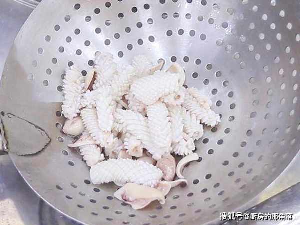 锅内烧水,加入一勺食盐入底味,水烧开以后把鱿鱼倒入锅中焯水30秒钟,鱿鱼打卷、变色以后倒出来,用清水冲洗干净控水,放入盘中淋上蒸鱼豉油,然后倒上蒜末、葱段等到激油。