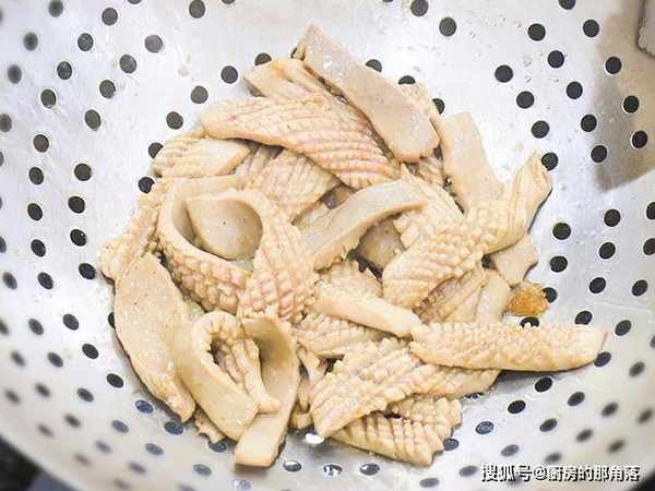 起锅烧油,油温六成热时倒入腰花,快速炒散立即倒出控油备用。