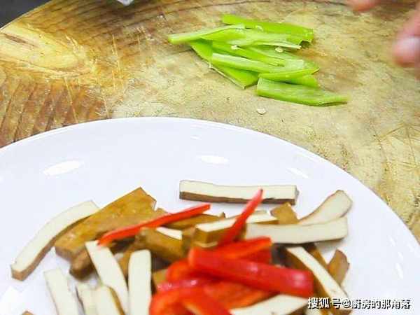 200克豆腐干切成大小均匀的条;一段大葱白切成马蹄片;半个红椒切成宽条;半个青椒去籽切成宽条。