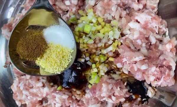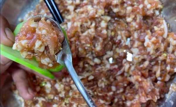 (多搅拌一会,搅拌的时间越长吃起来的口感越有嚼劲,搅拌至感觉肉馅中有阻力即可。)