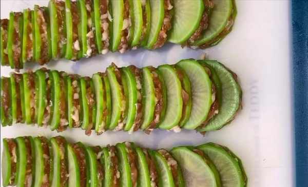 6.把调好的肉馅放入萝卜中夹起来备用。