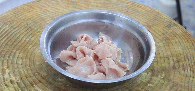 在做这道菜的时候,首先要将里脊肉洗净,有筋皮的最好把筋皮切下去。切成厚为3毫米的大片儿,放入锅中备用。在切的时候可以看到肉上面的纹路,不能顺着纹路切,顺着纹路的话煮出来的猪肉会非常老,一定要把纹路切断这样煮出来的猪肉才会嫩。