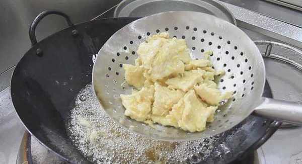 把花生油倒入以后,烧开,把猪肉依次放里面。这一过程中,动作一定要轻缓,避免热油迸溅发生意外。为了保证口感,我们每次放入的肉片数量不可过多,以防其炸糊,影响口感。