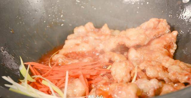 接着将炸好的肉片倒入,使肉片与锅内的食材充分接触,然后进行翻炒,接着在放入少许葱丝和胡萝卜丝,翻炒2分钟后,即可出锅,这样的做法是不是非常的简单呢,大家学会了吗?