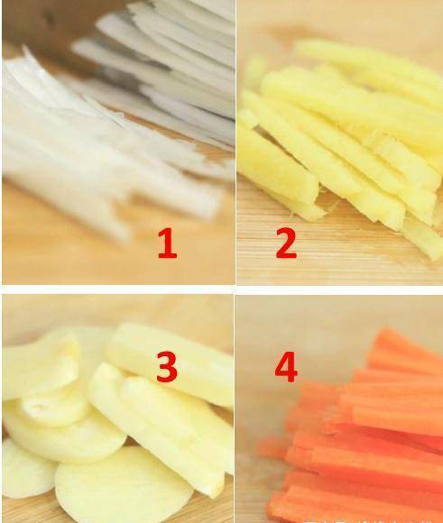 洗净的葱白切成葱丝,姜块去皮切成片,再切成丝,蒜去皮,切成片,胡萝卜去皮洗净,切成片,再切成细丝待用。在这里要说一下,葱姜蒜在某种程度上来说,对身体是比较有好处的。经常吃葱姜蒜的人,新陈代谢的速度,相比于一些平时不喜欢吃葱姜蒜的人会要快很多!