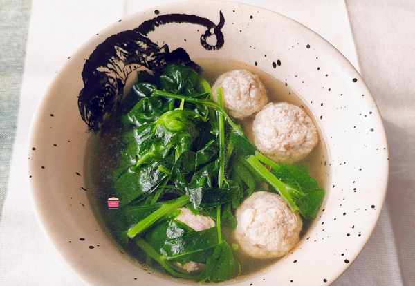 2、 锅中加入足量清水,水沸后转小火,把准备好的肉馅团成丸子依次下入锅中,丸子煮熟后,把清洗干净的菠菜放入锅中,再加入少许盐和白胡椒调味。