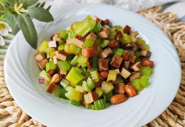 3、 将芹菜丁、豆干丁、油炸花生一起倒入盘中,依次加入生抽、蚝油、香醋、盐、糖、香油拌匀即可。