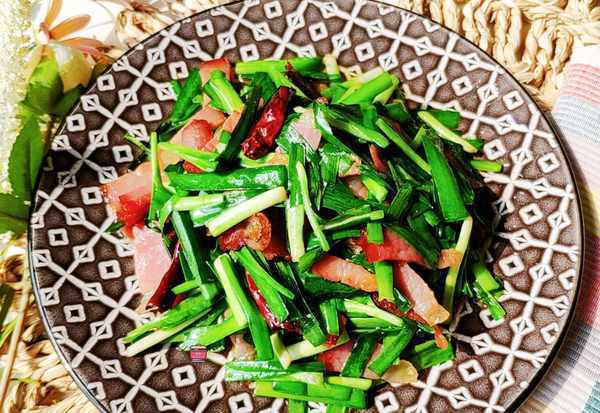 4、 腊肉炒香后,倒入韭菜段,两种食材一起翻炒2分钟,锅中加入少许生抽和糖调味,食材炒熟即可出锅。