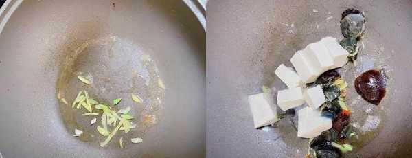 1、首先热锅放油,放入一些生姜和葱花,炒出香味,然后放入一些白豆腐和一个皮蛋,将皮蛋切碎,翻炒均匀。