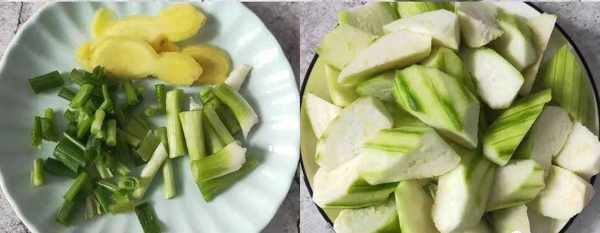 2、急着将丝瓜去皮,切成滚刀块备用。姜片和葱花都切好备用。