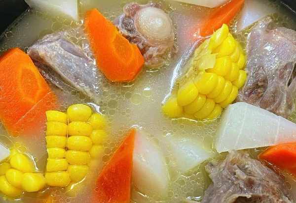 4、接着再放入胡萝卜、白萝卜和玉米,继续炖煮半个小时。煮好之后,加入食盐和胡椒粉,搅拌均匀入味即可出锅开吃。