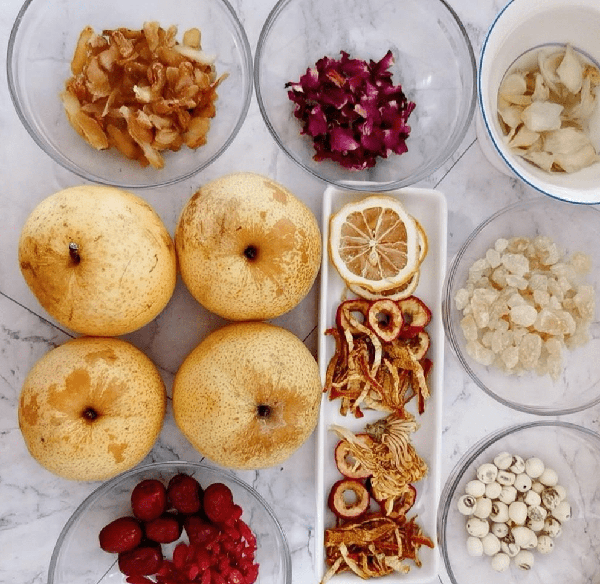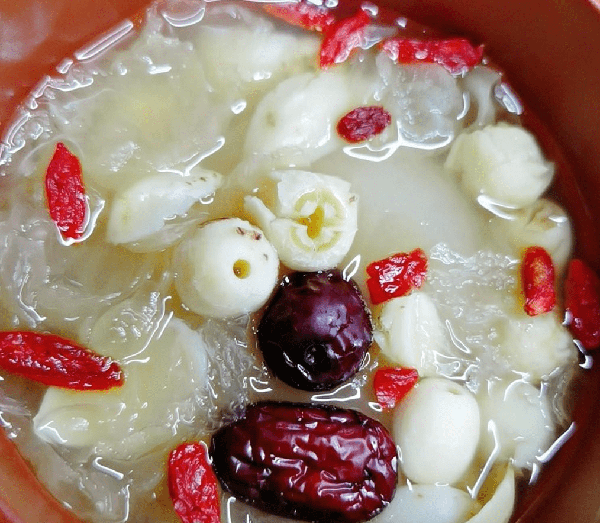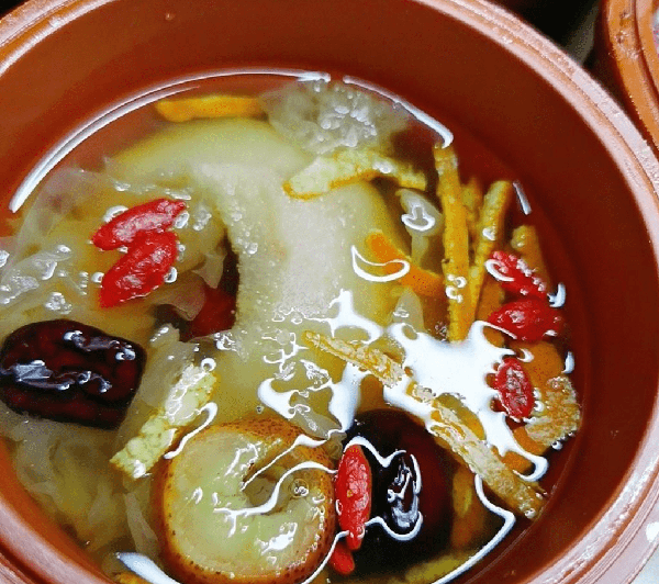 鲜皇冠梨4个,大枣24个,枸杞若干,银耳多2朵,山楂适量,柠檬陈4片,皮适量,莲子6克,百合12克,皇菊2朵,桂花玫瑰花适量,冰糖多一些。先将银耳洗净之后,放入锅中加入清水煮熟煮出胶质为止,然后将鸭梨去核去皮,放入冰糖加入清水,一起放入锅中煮熟盛出备用。