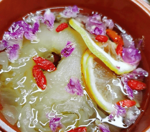 制作方法:将煮熟的梨子盛出,装入砂杯之中,倒入提前准备好的银耳胶与冰糖水,放入几粒枸杞,加入提前买好的“柠檬片和玫瑰花”,然后放入烤箱也烤制15分钟,之后取出就可以食用了,玫瑰柠檬口味的烤梨与众不同,甜酸适口,带有淡淡的玫瑰花香,加上冰糖的甘甜,别提多好吃了。而玫瑰花可以解除肝郁,柠檬可以提高免疫力,补充维生素C,加上冰糖与鸭梨的滋阴润燥,让这道小吃美味可口。