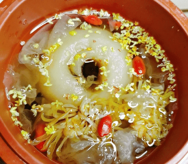 制作方法:将煮熟的梨子盛出,装入砂杯之中,倒入提前煮好的银耳胶与冰糖水,放入几粒枸杞,加入提前准备好的“桂花”和”皇菊“,最后放入烤箱烤制15分钟,之后取出就可以食用了,这么做出来的烤梨带有菊花和桂花的香气,还有枸杞的甘甜与冰糖的滋润十分好吃。桂花与皇菊可以“明目,去火“配合冰糖与鸭梨滋阴润燥,加上烤制地方法来食用,可以说是美味又营养。