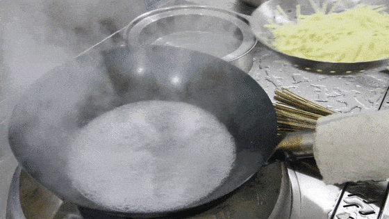 加入食盐2克 ,白糖2克 ,加入一勺(20克)白醋,白醋放入的时机要早一点,太晚了,土豆丝就失去了脆爽的口感,快速的把白醋翻炒均匀,这个翻炒过程,不能超过5秒钟,翻炒5秒钟以后,我们出锅装盘~