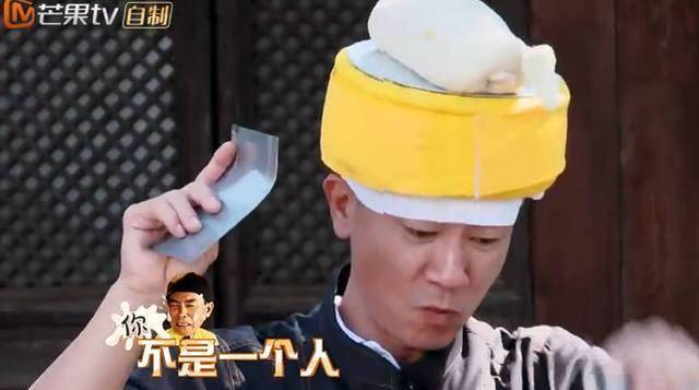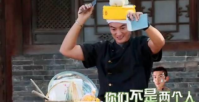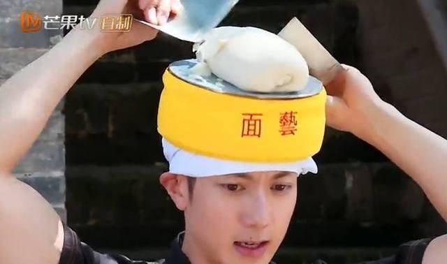 邓伦邓师傅,直接面饼从头上滑了下来。第二次还将整个面饼滚到开水中,只能说年轻人体力好,力气用得有点过猛了。