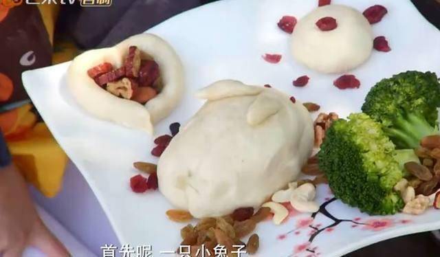邓伦的创意面食:里面有小山竹最喜欢的小兔子,又有她喜欢的爱心、绿草、果实和阳光,最大的寓意就是希望小山竹能在这么美好的环境里快快长大。