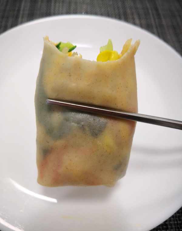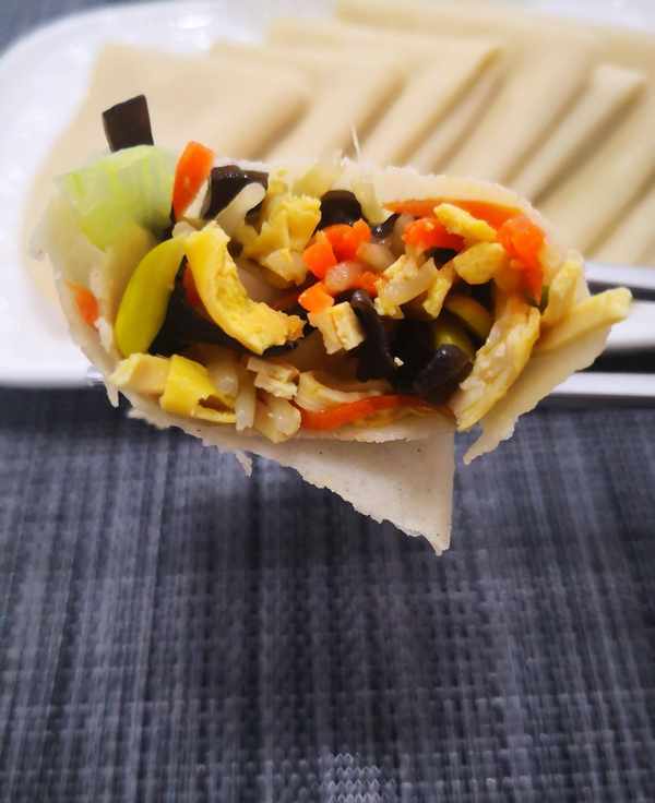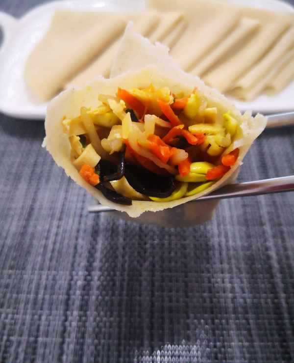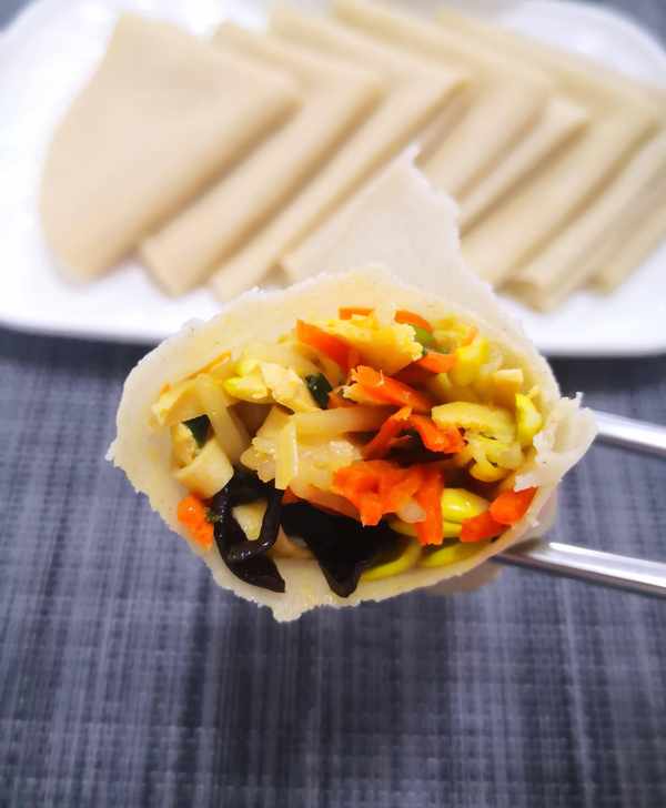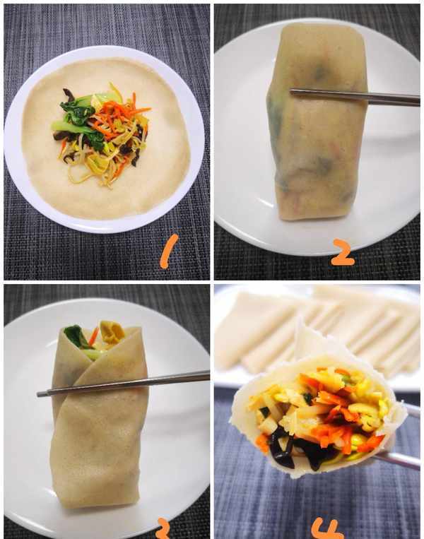 1~4.铺上一张薄饼,加上蔬菜,卷起来即可。