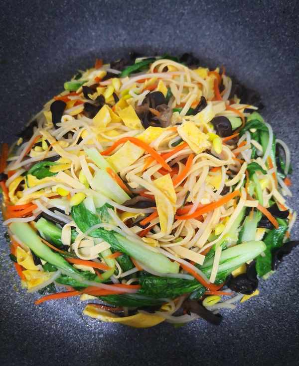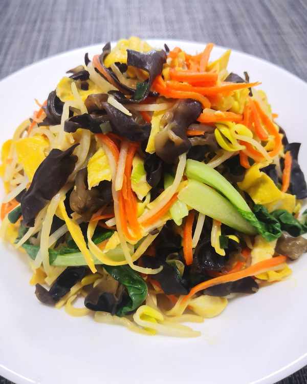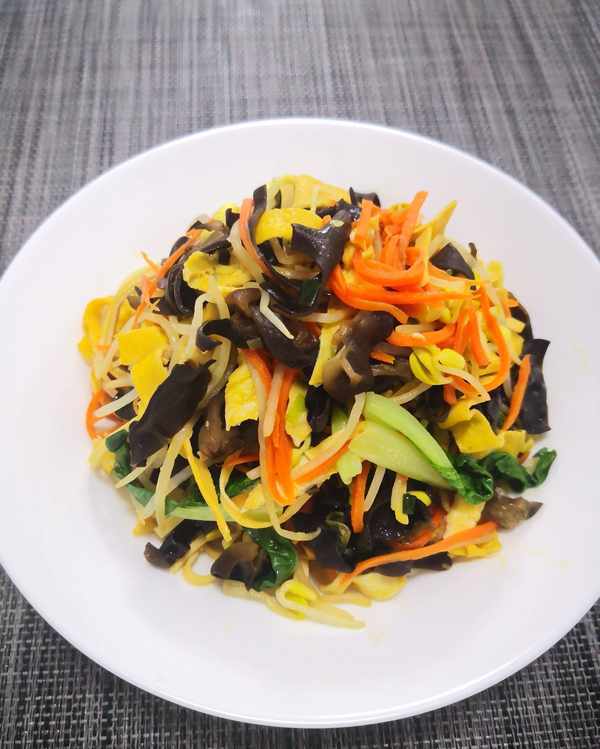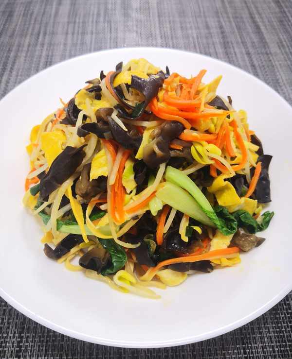 豆芽、小青菜、干豆腐、黑木耳、鸡蛋、胡萝卜