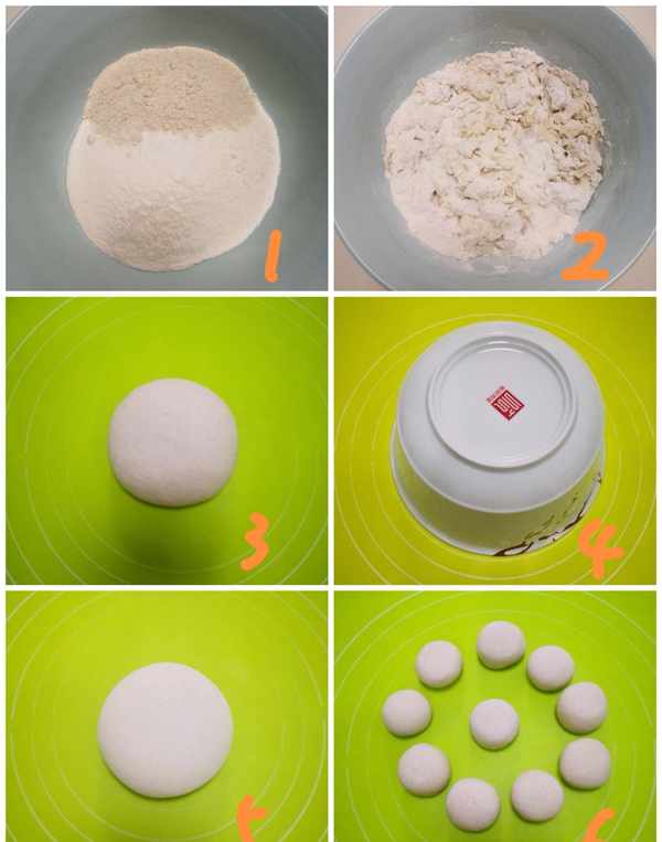 2~4.先拌均匀,再用五六十度热水和面,上手揉成软硬适中的面团,多揉一揉,反扣大碗醒面约30分钟。