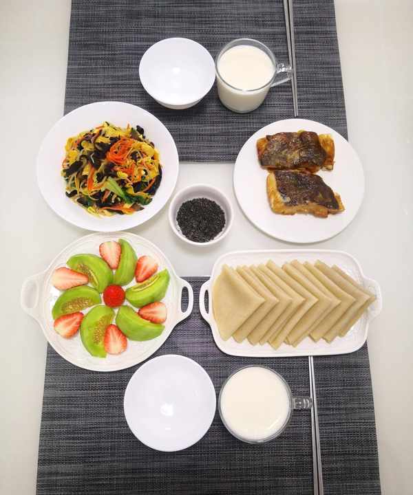 粗细粮结合的蒸薄饼,蒸的很健康,搭配炒大合菜,一锅出,简单又省事,再来点动物食物、新鲜水果和少许自己做的黑芝麻粉,香醇味美,营养全面身体棒!