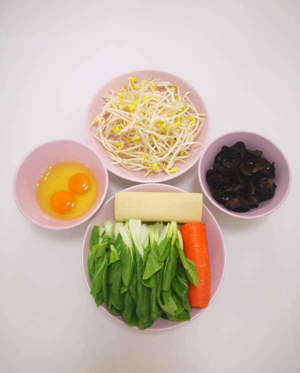 准备豆芽、鸡蛋、干豆腐、青菜、胡萝卜、泡开的黑木耳。