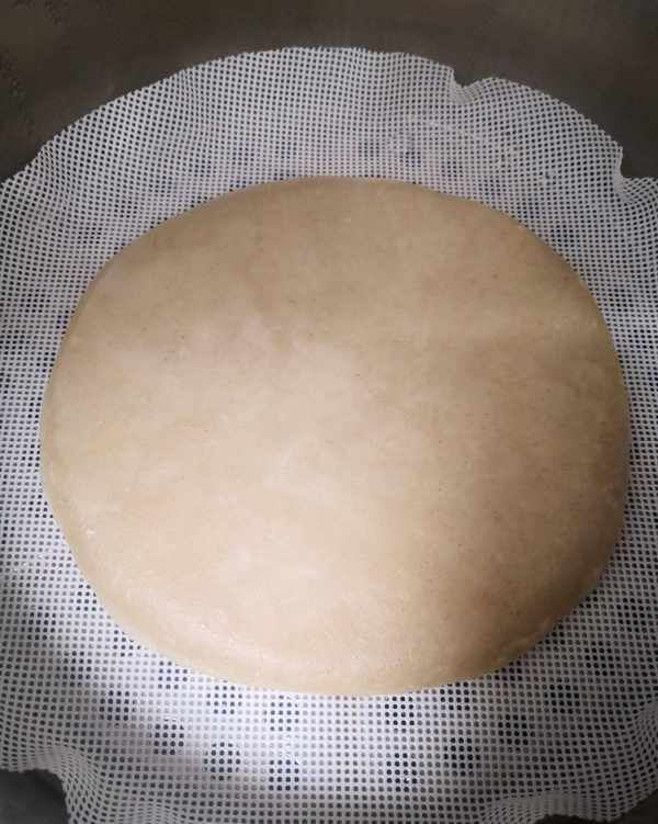 蒸锅里加适量的凉水,把生胚放在蒸布上。