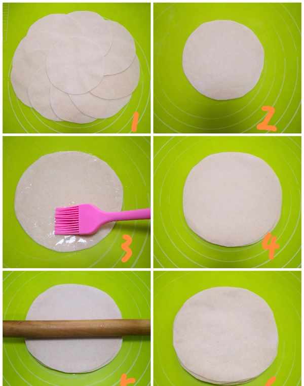 3~4.继续铺上一张面片,再刷薄油,如此重复,直到铺完最后一张面片,最后一张面片无需刷油。