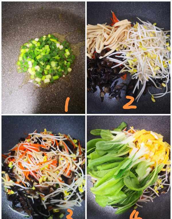 2~3.倒入胡萝卜、木耳、干豆腐、豆芽,翻炒至变软。