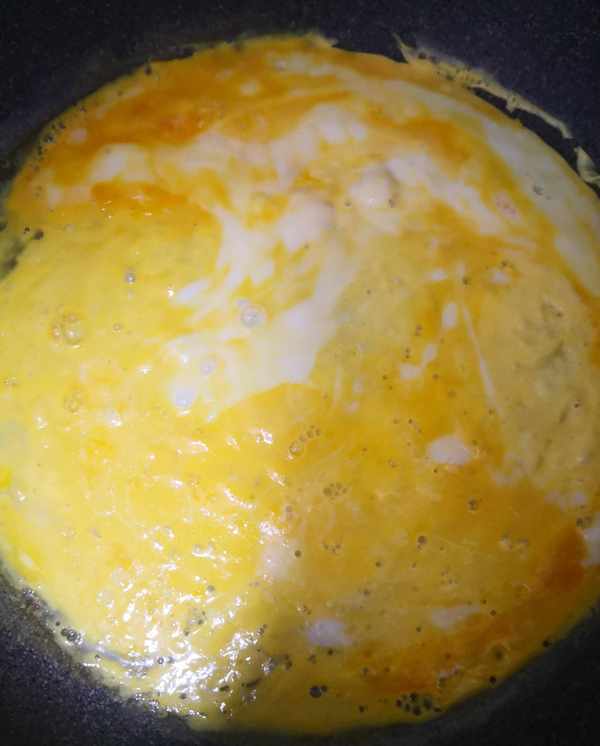 鸡蛋搅散后倒入平底锅里,摊至蛋液凝固,放凉后切成细长条。
